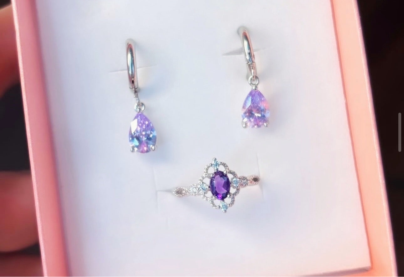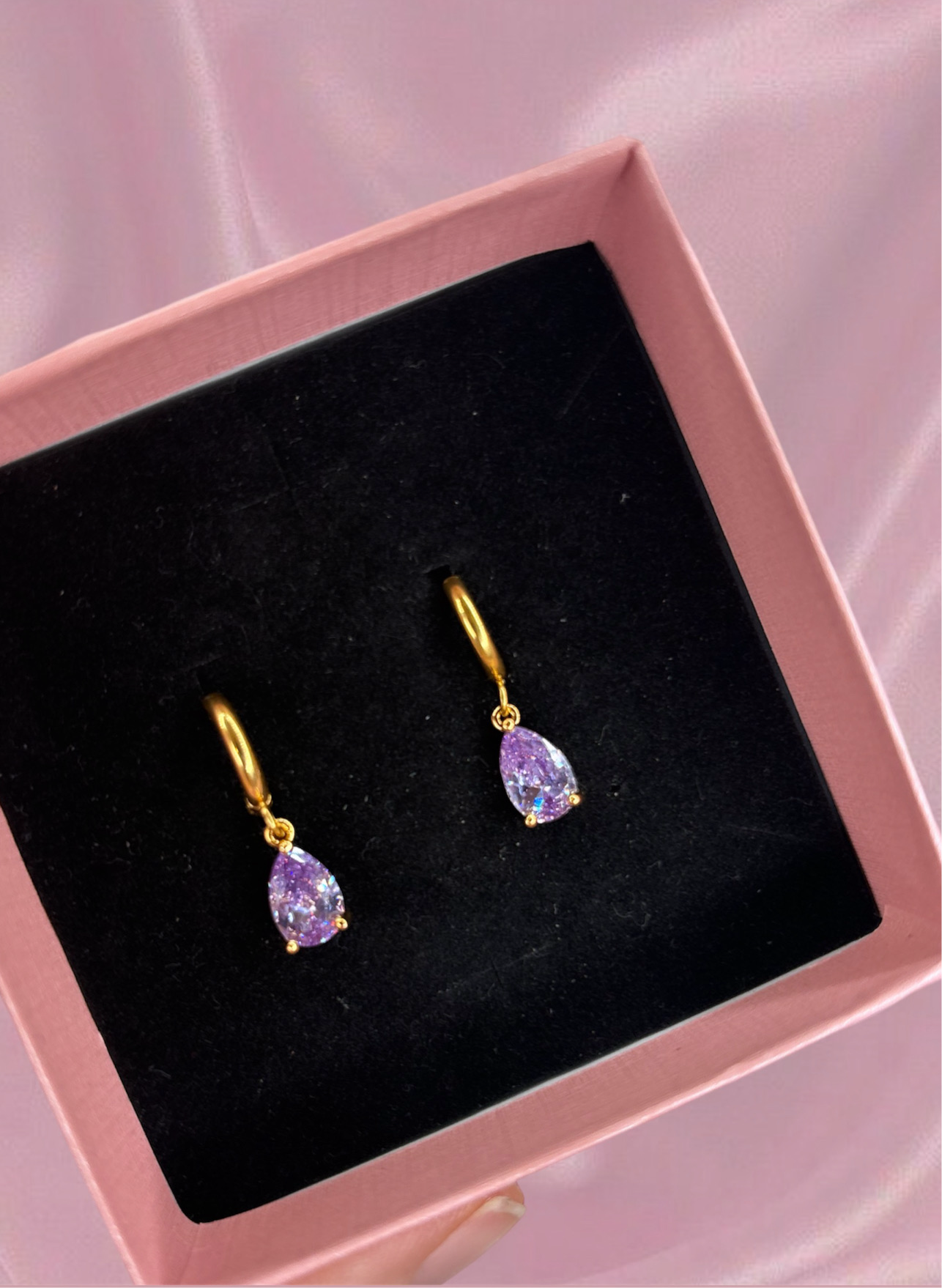 Orecchini in acciaio inossidabile in versione argento e dorata con gocce lilla super luminose