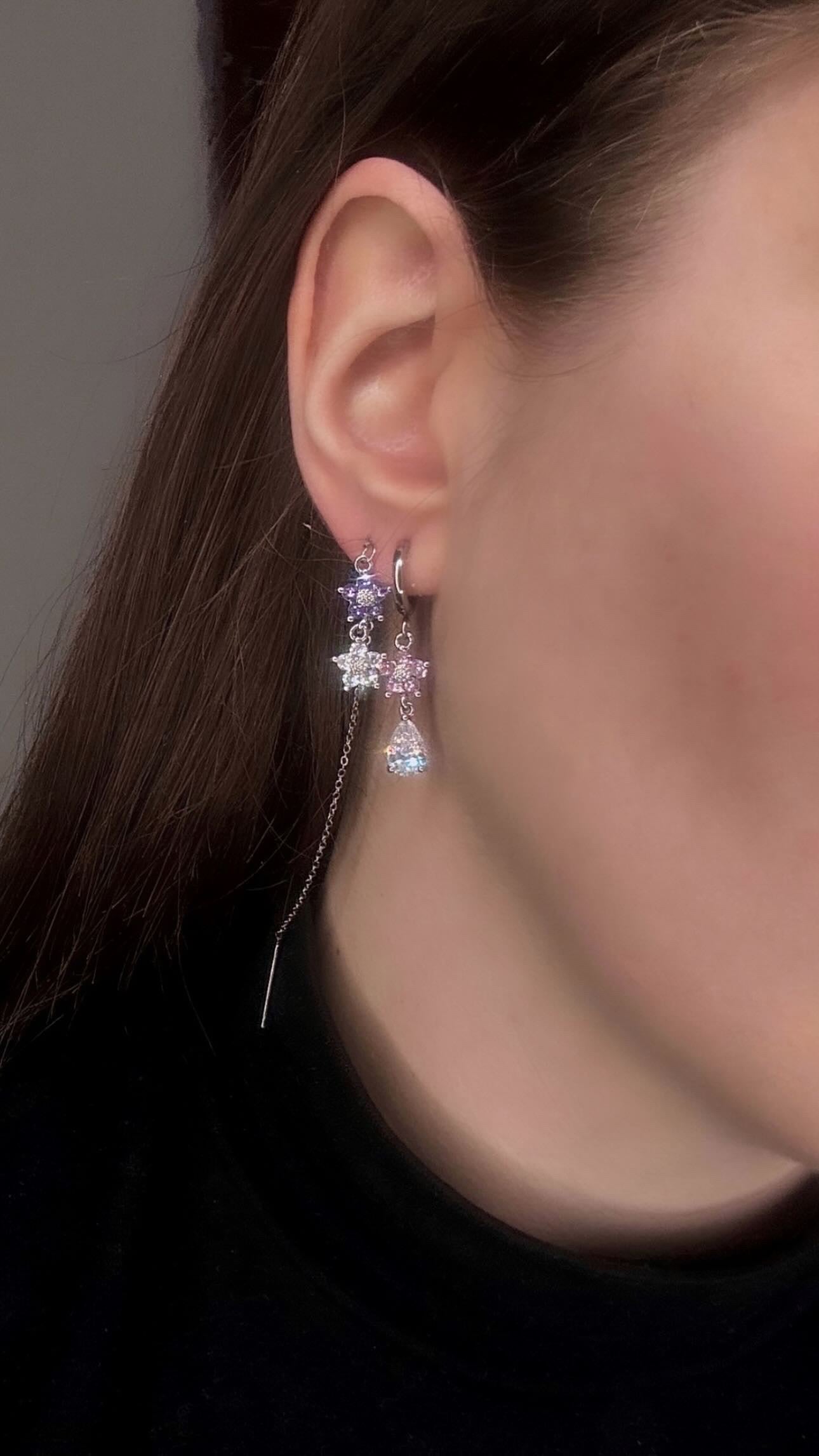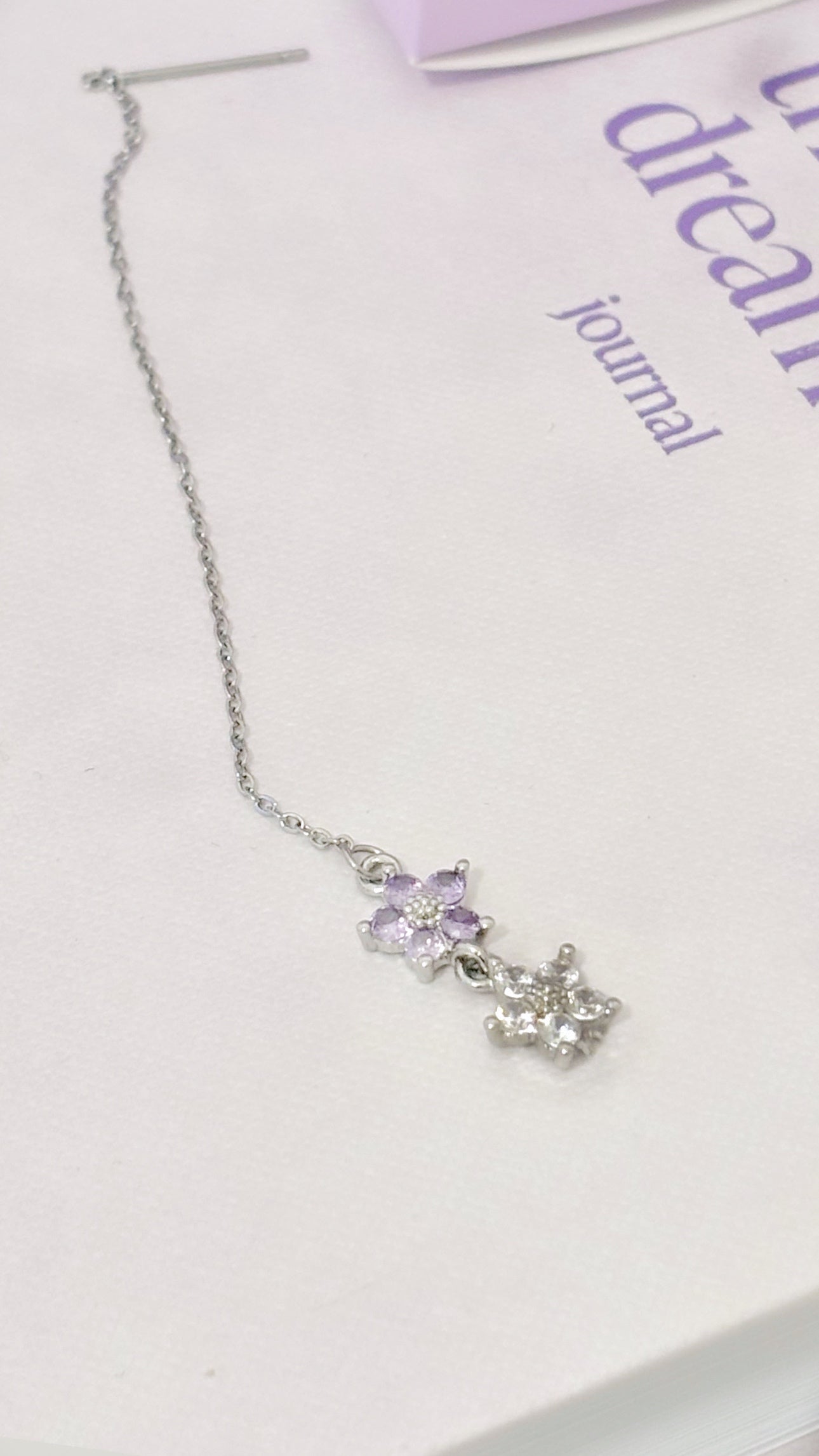 SINGOLO Saliscendi in acciaio inossidabile con due fiorellini zirconati lilla e bianco (puoi scegliere anche la versione rosa chiaro al posto del lilla)